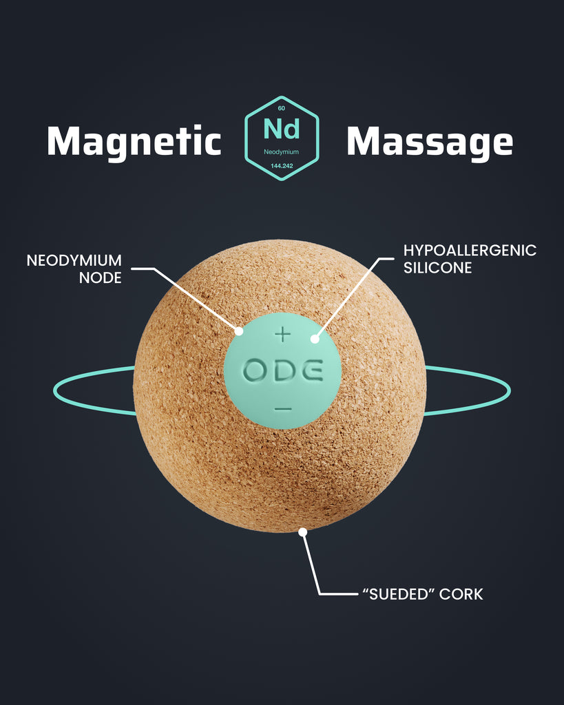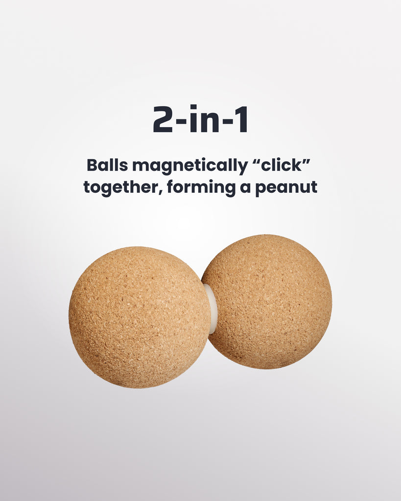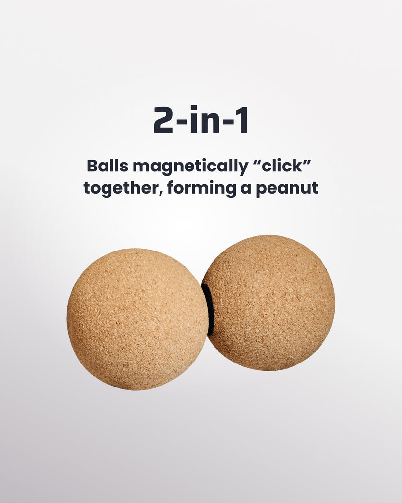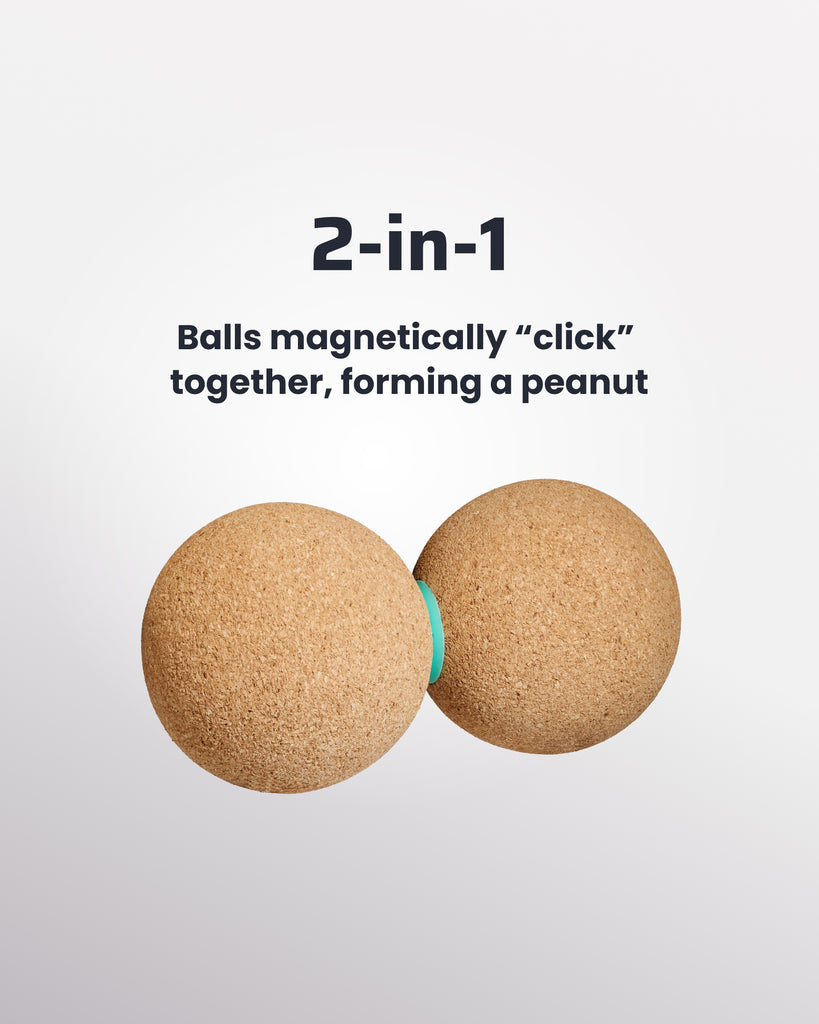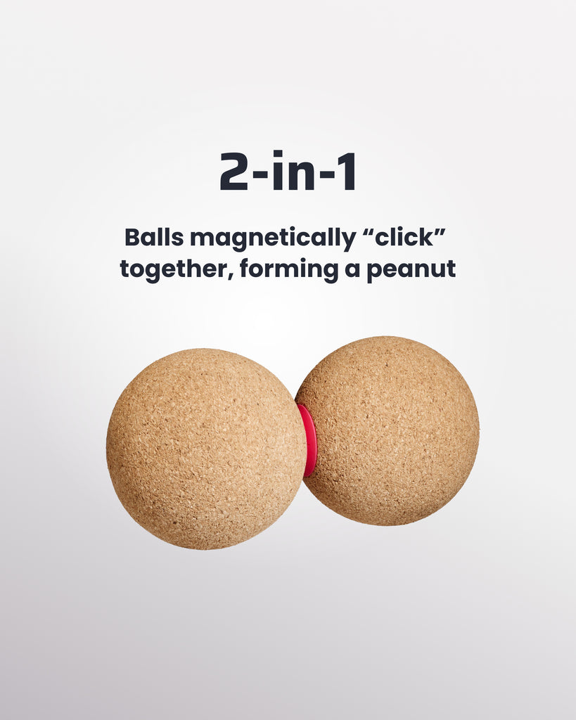The first magnet-infused cork massage ball set. Connect them for a "peanut" shape, or use individually for targeted muscle relief.